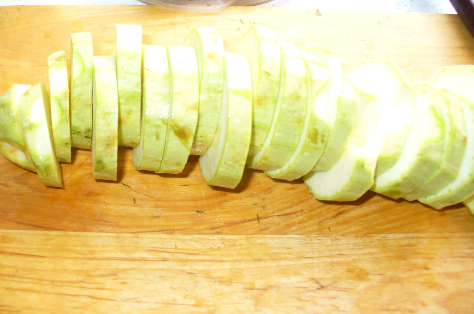 - Переходимо до овочів. Нарізаємо кільцями кабачок і обсмажуємо з двох сторін на розігрітій сковороді.
