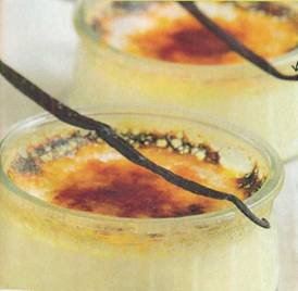 Продовжуючи збивати, тонкою цівкою вливай киплячу молочну суміш в жовтки. Розлий по керамічним або скляним формах. Постав їх у велику форму, залиту водою до середини формочок. Запікати в духовці при 1 140 ° С протягом 40 хв. (Перевірка готовності: встромлений в масу ніж повинен залишитися сухим). Постав в холодильник. Перед подачею до столу посип цукром і закарамелізіруй спеціальним пальником або в грилі духовки.
