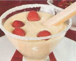 Краї келихів злегка зволожить і «окуні» в цукрову пудру. Розклади десерт по креманках, прикрась ягодами і печивом.