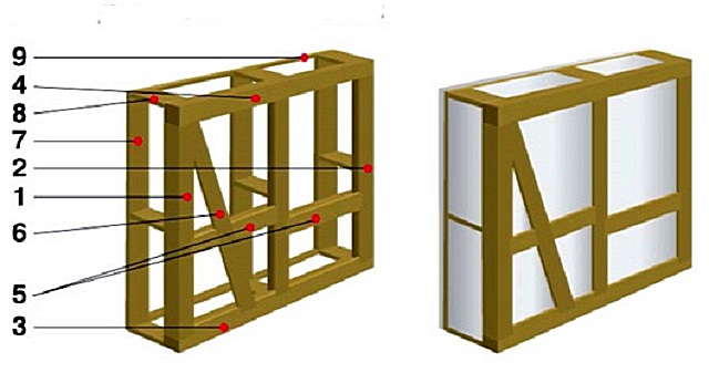 Основні вертикальні і горизонтальні елементи каркаса додатково зміцнюється укосинами. Традиційно всі деталі конструкції скріплюються між собою способом врізки, завдяки чому в результаті виходить міцний і надійний каркас.