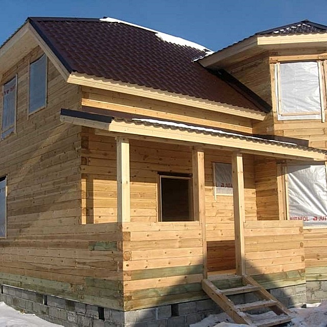 - каркасна конструкція. Міцність каркасного будинку залежить від товщини бруса і його якості, а також від проведення монтажних робіт. Для забезпечення максимально можливої довговічності каркасних будівель, необхідно захистити їх зовнішні поверхні від впливу агресивних природних чинників. Тобто в обов'язковому порядку потрібно зовнішня обробка.