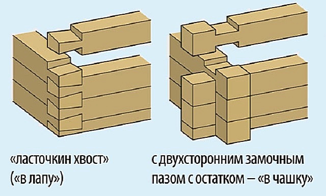 Існує два види основних типи з'єднань – це «в чашку» (із залишком) і «в лапу» (без залишку). Але, в свою чергу, кожен з них поділяється на кілька різновидів: