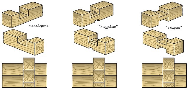 - Стиковка на кутах «в чашку» може бути виконана в декількох варіантах, але найпопулярнішими з них є «в охряп», «в курдюка» і просте з'єднання «в полдерева»: